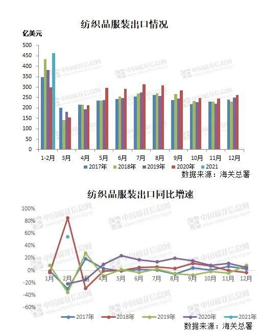 紡織品服裝出口按美元計:2021年1-2月,紡織服裝累計出口461.8億美元,增長55.0%,其中紡織品出口221.3億美元,增長60.8%,服裝出口240.5億美元,增長50.0%。